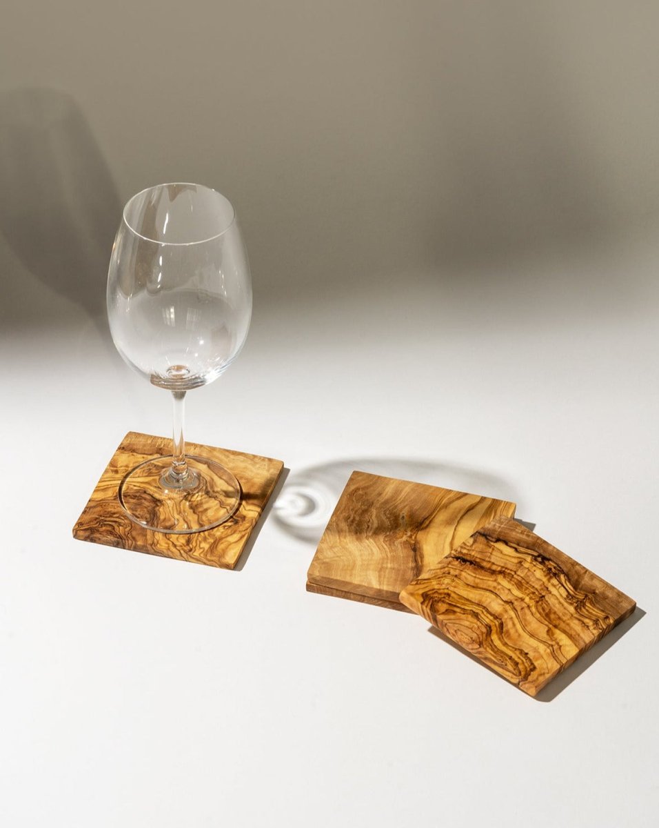 Les sous tasses, ou dessous de verre, en bois d'olivier arborent les motifs naturels des arbres d'origine cultivés dans un sol fertil depuis plusieurs années, fournissant un aspect entièrement unique et rehaussant chaque table.
