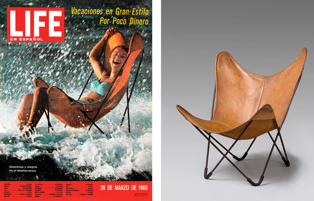 Concernant l'image à gauche, couverture LIFE, 1966, Fundación IDA. À droite, fauteuil BKF, Groupe Austral, 1938, Museu del Disseny, Barcelone.