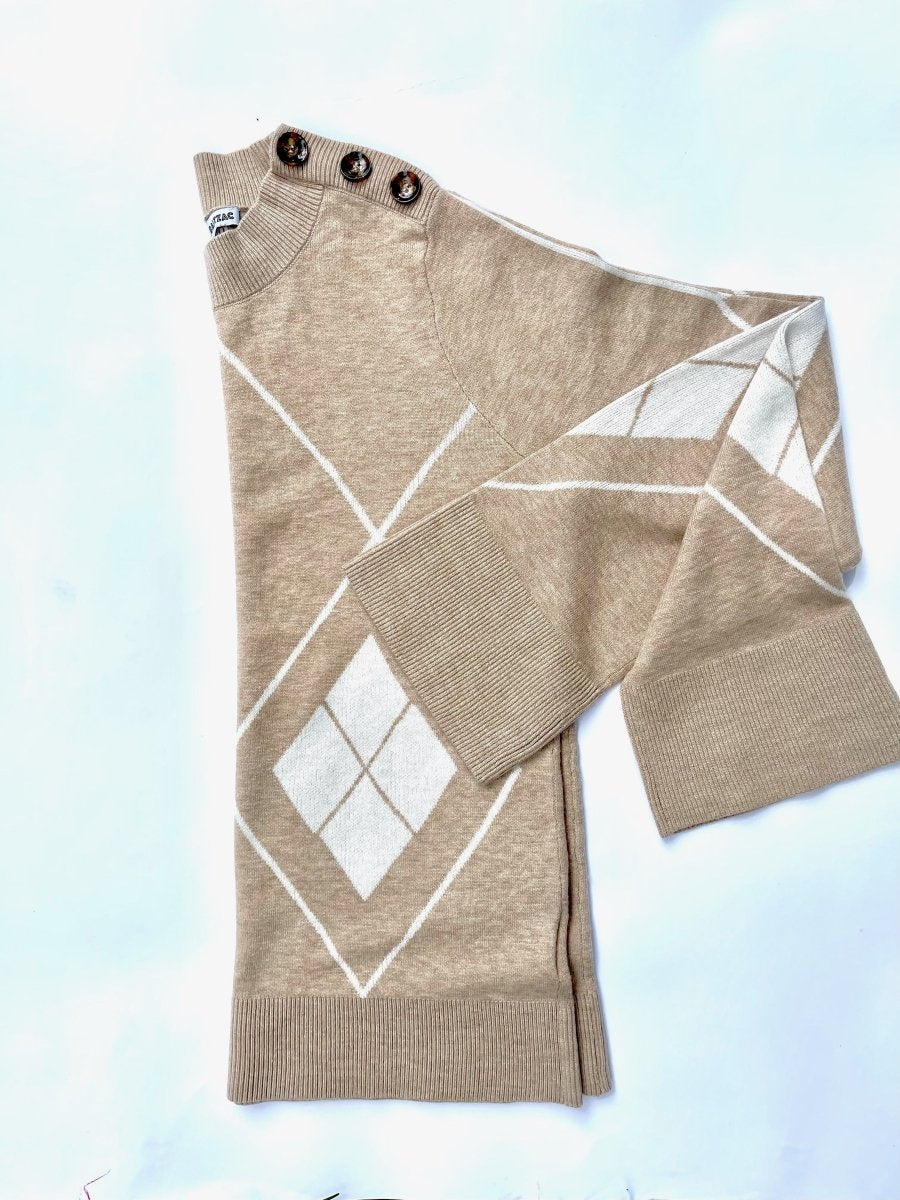 Le pull Magenta est sans aucun doute un véritable incontournable. Il est rehaussé d’un motif argyle et de trois boutons sur l’épaule gauche. Les manches s’évasent aux poignets pour un effet plus dramatique. Il contient une touche de cachemire qui le rend encore plus doux.