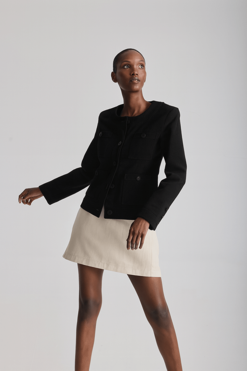La veste Saskia en velours côtelé présente un col rond, quatre poches à rabat et des boutons recouverts. Sa texture chaleureuse et son esprit automnal en font une mise à jour élégante et facile à porter de vos basiques quotidiens.