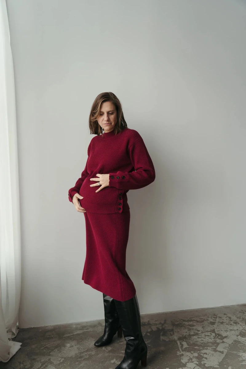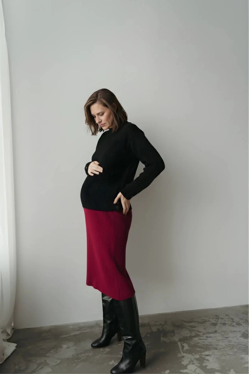 L'association du chandail Émile, et de la jupe Carla crée une robe de maternité chic et idéale pour diverses occasions.
