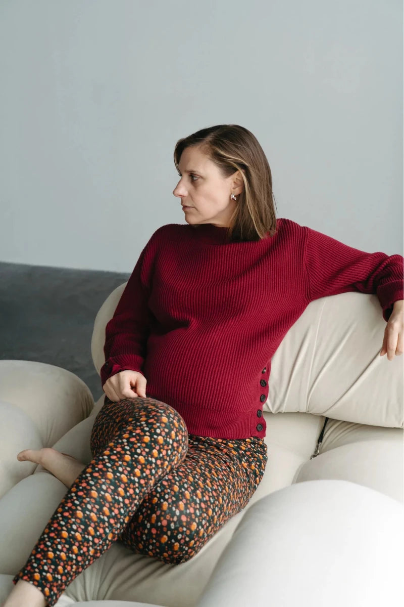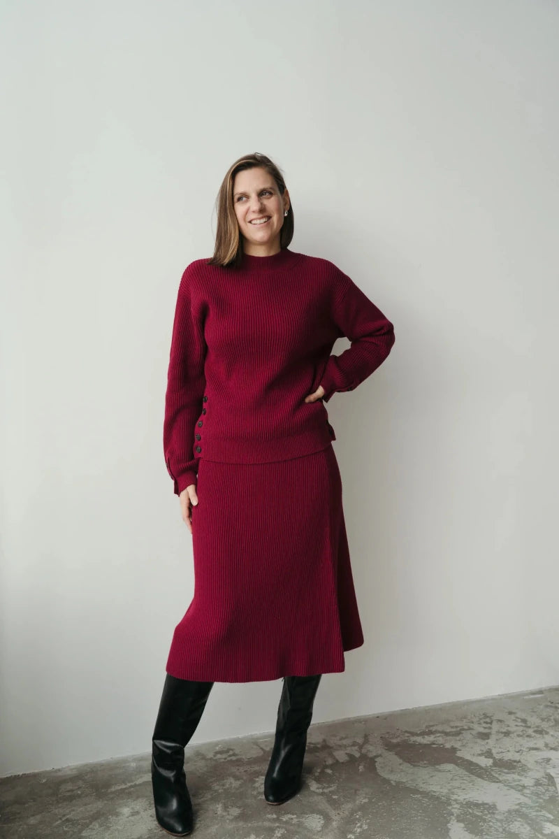 L'association du chandail Émile, et de la jupe Charlotte crée une robe de maternité chic et idéale pour diverses occasions.