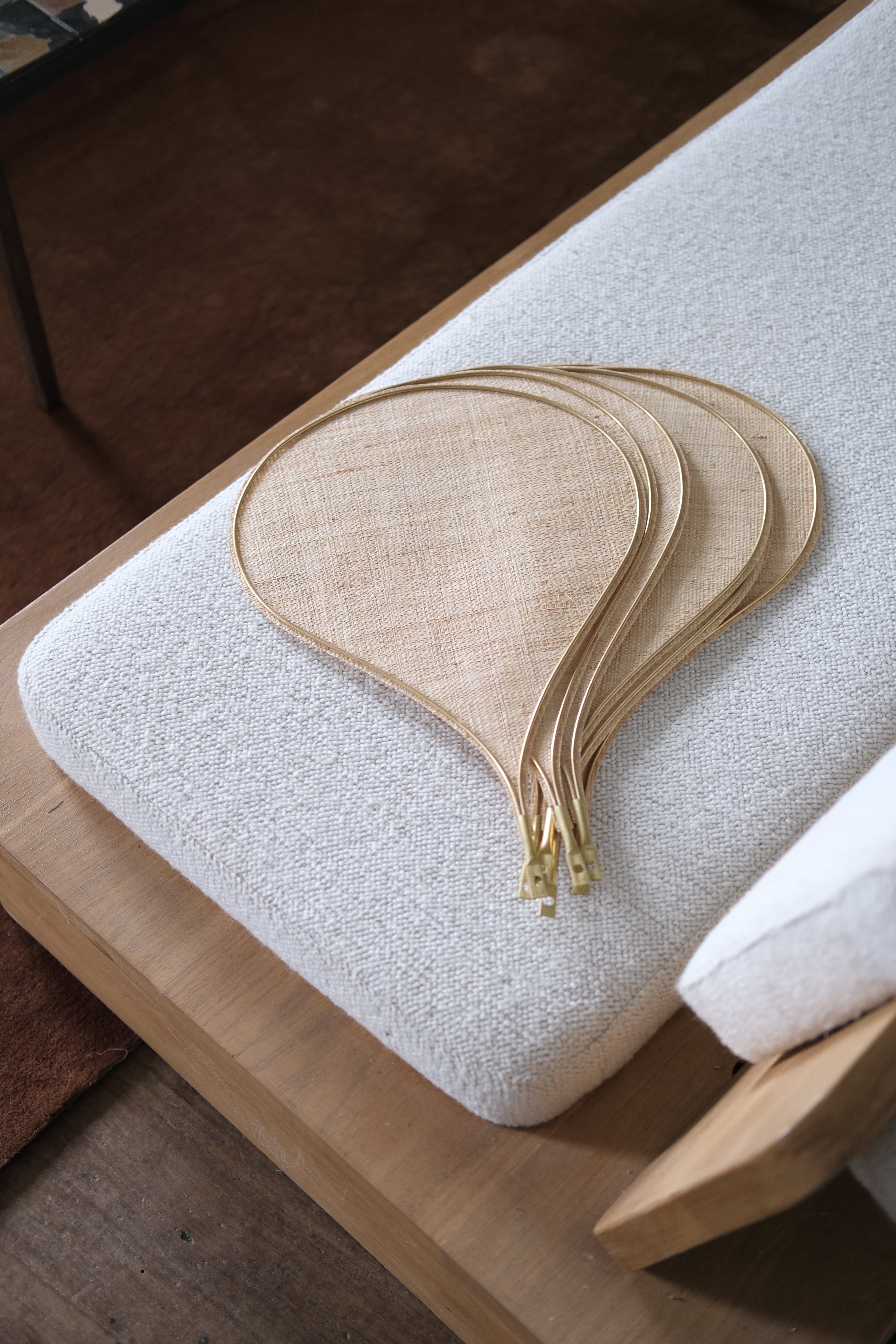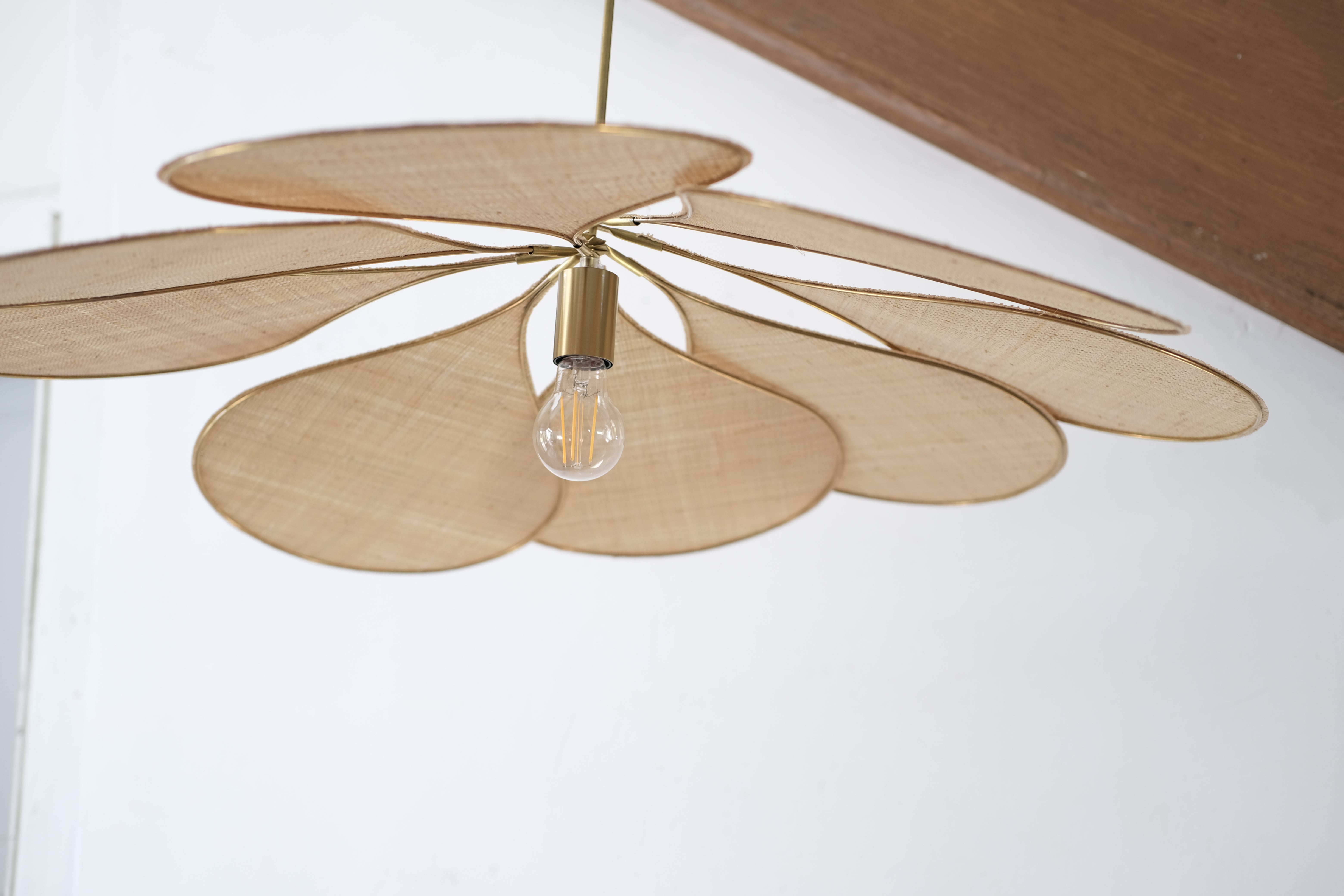 Georges' iconic light in its original format.The unexpected combination of brass, rattan and fabric in a floral and airy suspension.With the simplicity of a drop-shaped petal, Pale adds a tribute to the retro ceiling fans of louvered bedrooms. This pendant light plays subtly with light, diffusing a soft light in the room and delicate play of shadows on the ceiling.Its 8 adjustable petals allow you to compose your own play of lights and turn it into a unique luminaire.