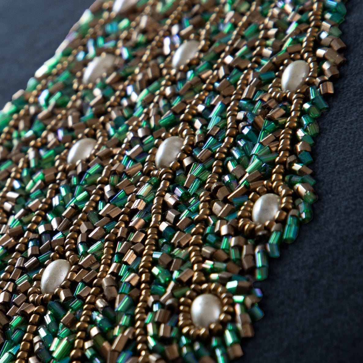 The centerpiece is a magnificent peacock tail, meticulously hand-beaded for a unique, artisanal finish.