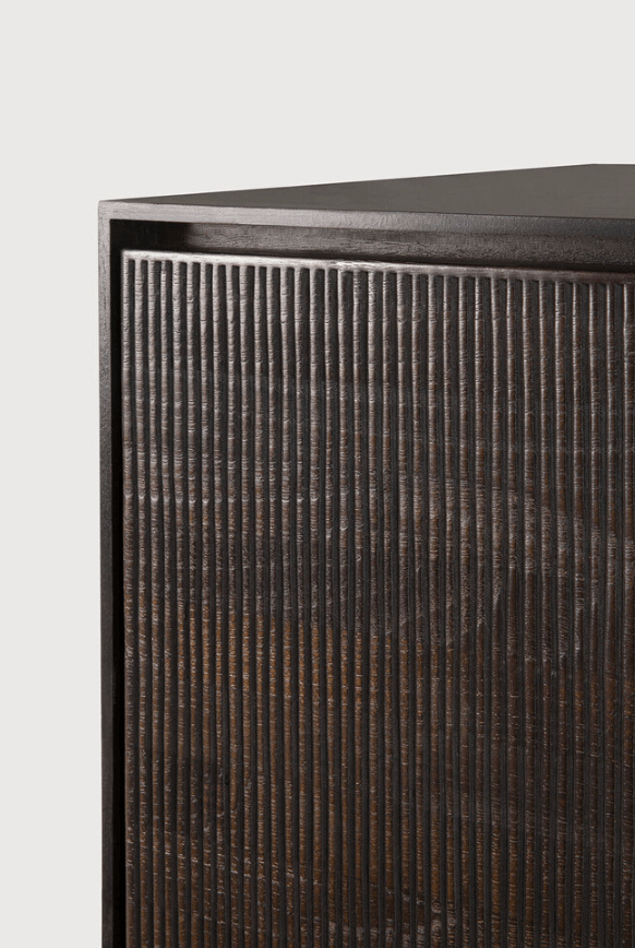 Chaque meuble TV Grooves est une œuvre unique, sculptée à la main avec soin. Les légères imperfections naturelles témoignent de son authenticité et renforcent son caractère. Le teck teinté foncé sublime également l'intérieur, offrant des étagères et tiroirs pratiques pour organiser vos objets précieux. Disponible en précommande, délai de fabrication entre 4 et 8 semaines. Un choix parfait pour ceux qui apprécient l'artisanat et l'originalité dans leur intérieur.